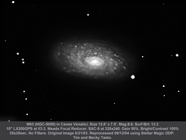 Raw Image Before Processing Final Image After Processing This tutorial only presents a small snapshot of image processing techniques and contains a minimal number of steps. Many more/different things could have been done to the image (i.e. removal of the gradient using more "elegant" techniques than a brute force power law stretch that destroyed background detail, or processing to prevent the stars from turning harsh white, or even preserving IC-1296 while still emphasizing M57). The process up to and including Step 3 is usually imperative. After that, it's really up to you! Hope this helps! Return to Deep Space Imaging and Astrophotography Main Page All images copyright (c) Tim Tasto and Becky Tasto Image Processing