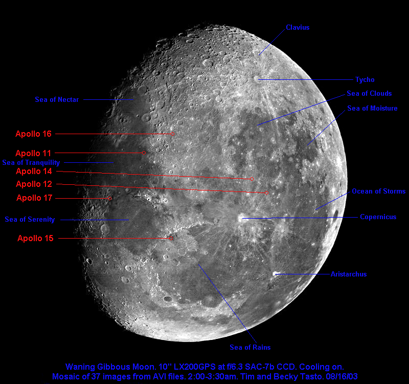 This image of the moon was obtained with the SAC-7b imager on 08/16/03 at about 3:00am. 37 different AVI files were taken through the Meade 10" LX200GPS at f/6.3. Out of about 60 images per AVI file, one frame was selected that represented the best of the 60 images. The resulting 37 "best" images were then assembled into the mosaic below, which is only 25% of the size of the image originally assembled. Some selected major features are labeled, along with approximate landing sites of the Apollo missions. Also, here is a link
